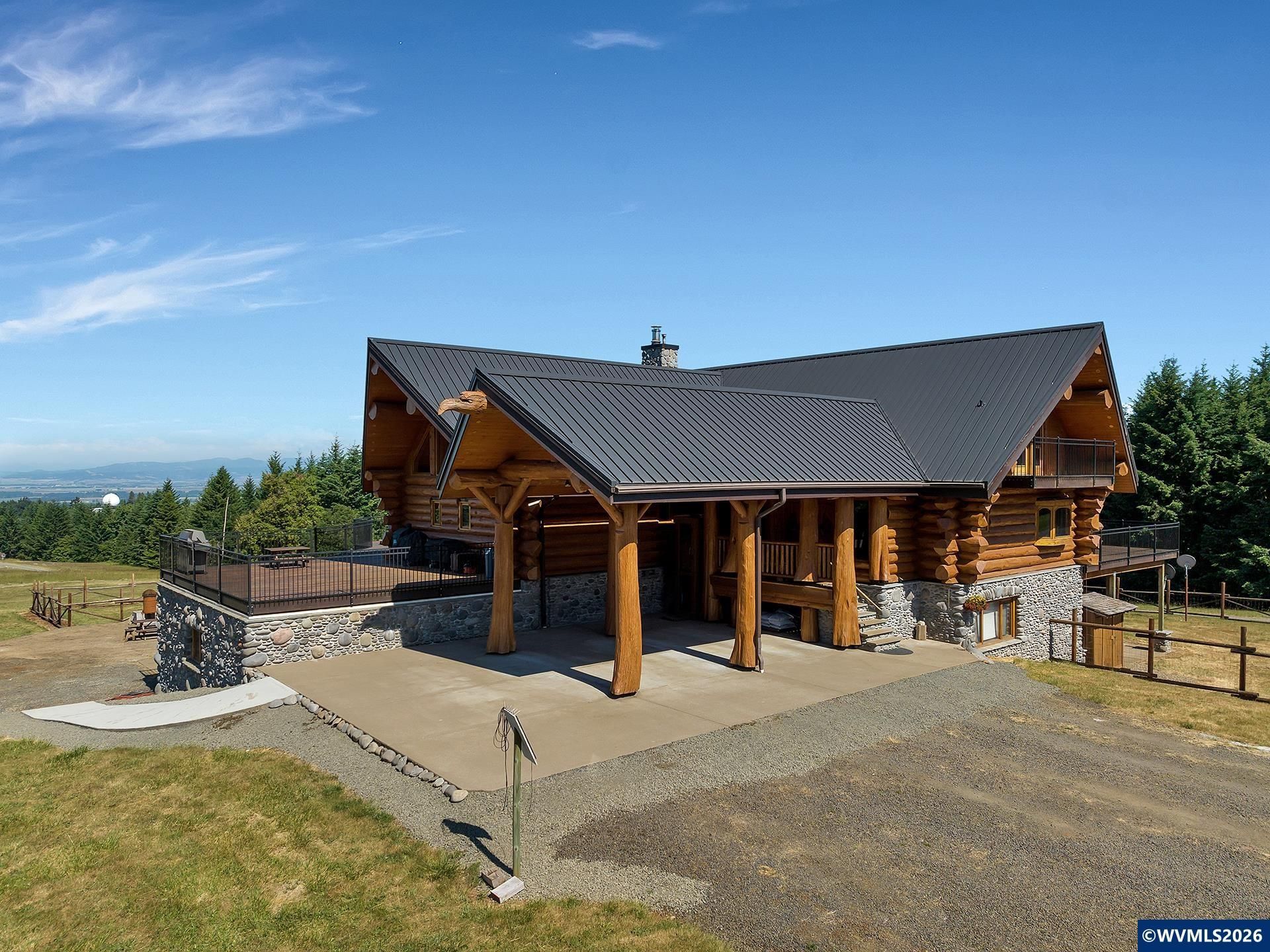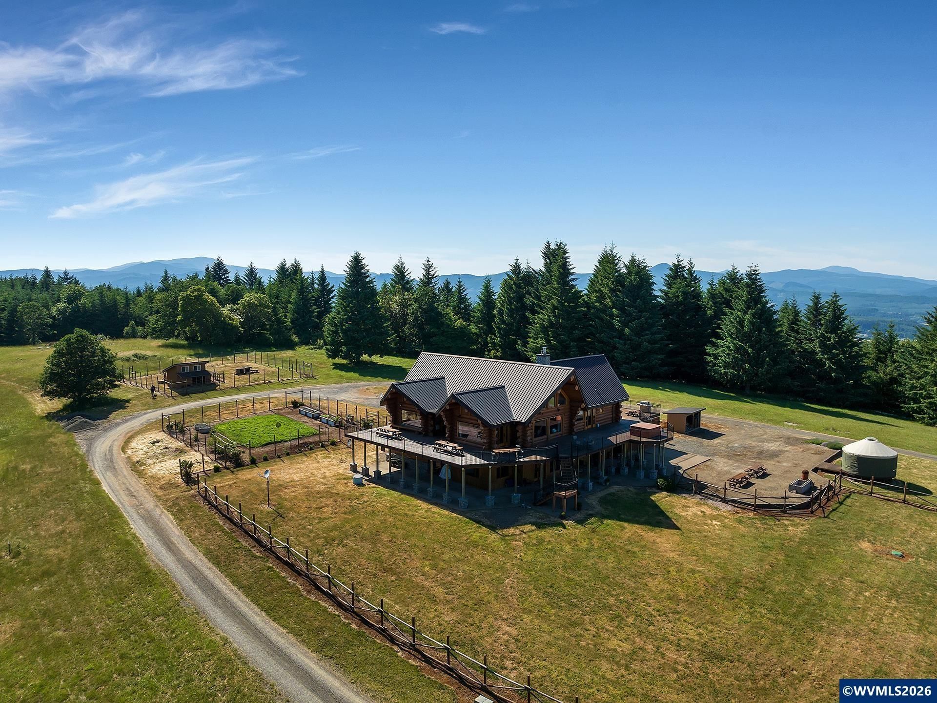Secluded custom Pioneer log home with panoramic Willamette Valley views on 122+ acres of pasture and timber. Just 21 miles to Eugene Airport and Corvallis. Features a 2,400 sq ft wraparound deck, hot tub, and abundant wildlife. Main level offers a vaulted primary suite with steam shower and jacuzzi, plus office, pantry, and kitchen. Lower level has 2 beds, bath, living area. Includes orchard, yurt garden, 2 parcels, timber, and artisan spring not far from the home. This is truly a stunning must see!