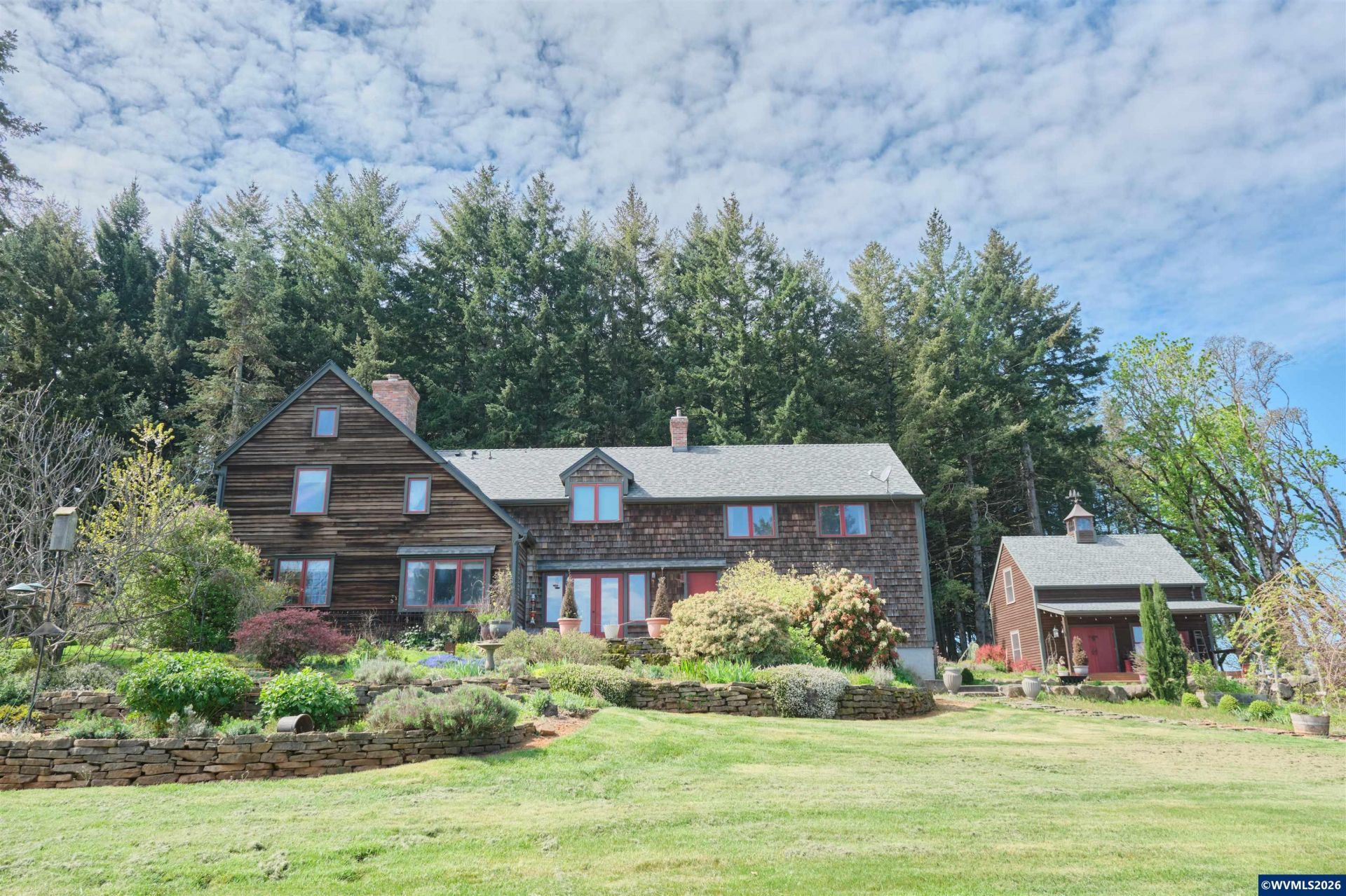Stunning! This salt-box style home is one of a kind. Reclaimed floors, beams, and rustic hardware throughout. You'd feel like you were in New England if it weren't for the stunning views of Mt Hood and Mt Jefferson, local vineyards, and the capital building. Three fireplaces, two primary suites, 5 bedrooms, an office, mudroom, beautiful kitchen and tasteful designer colors used throughout the home. Cameras recoding on site.