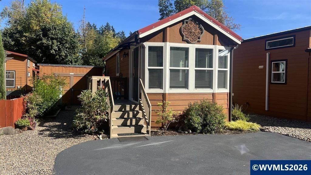 Light, bright, cheery, and cozy! This may be a tiny home, but it is packed with storage and well-laid-out space! Along with an oversized shed. Easy to maintain secret garden to enjoy! This community boasts multiple amenities: pool/hot tub, hiking path, pickleball/tennis, lodge, community garden, lake and gym. Along with water/sewer/garbage, which are all included in the space rent. Come and see for yourself what a delightful home this is!